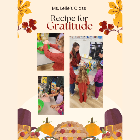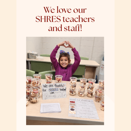 This week, Ms. Lelie's Class at SHRES learned about Gratitude. Ms. D'Avirro, our student teacher, read "Gratitude is My Superpower." The students participated in several activities where they expressed their gratitude and what they are thankful for. The final project of showing gratitude was making a special snack for all of the amazing teachers and staff at SHRES.