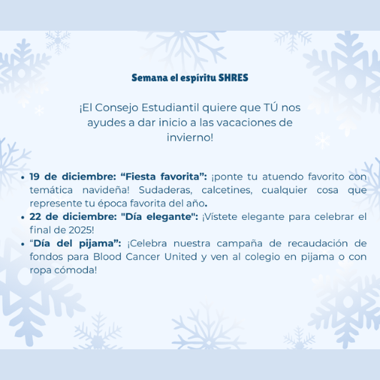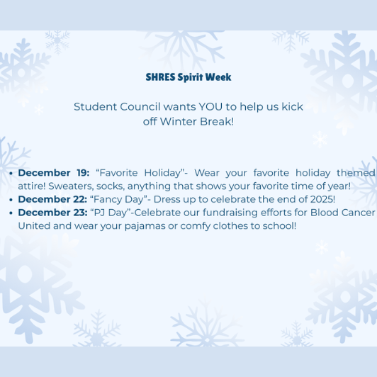 Spirit Days 12/19, 12/22, 12/23Please see and share the attached memo (below). Staff are invited to participate in the fun!
